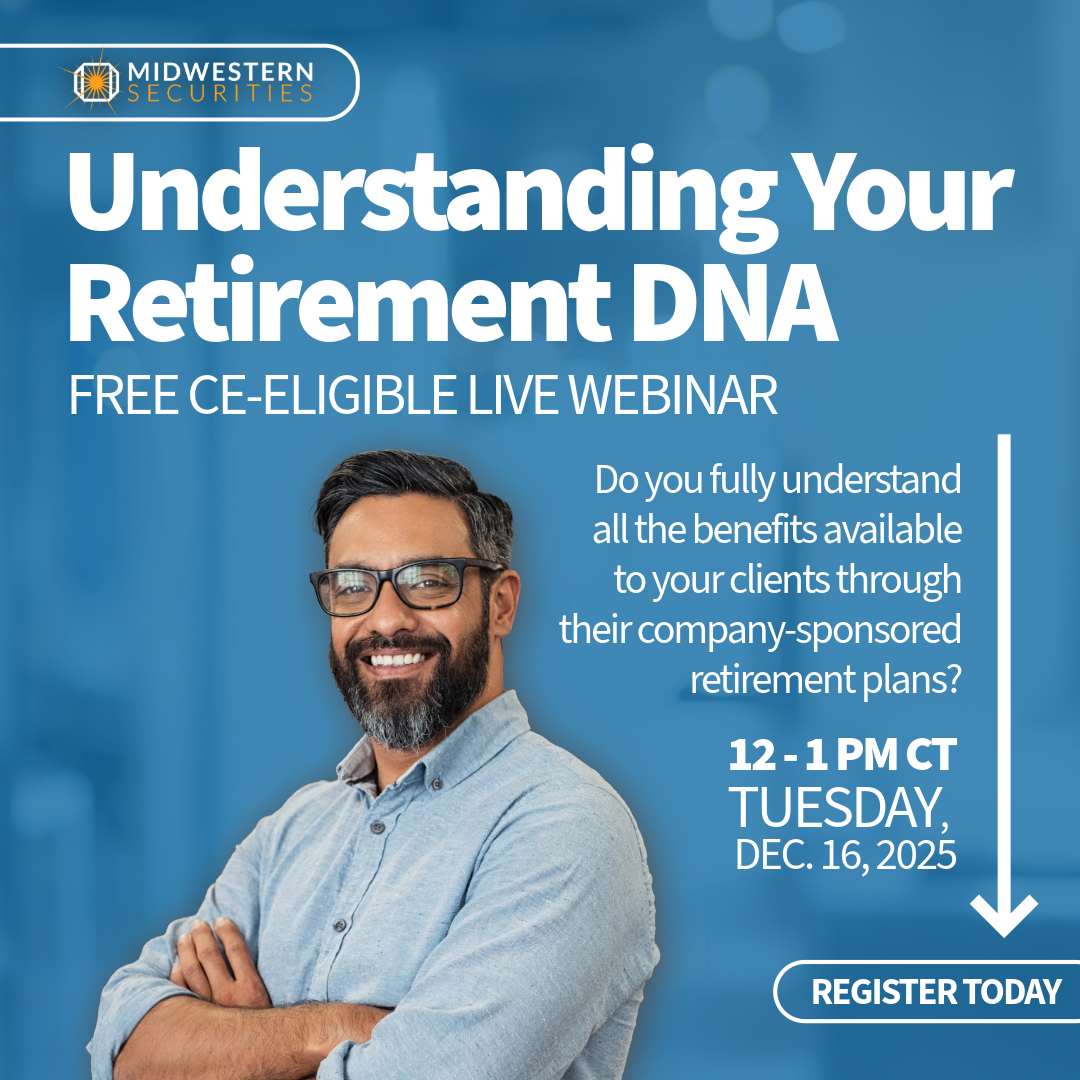 Join Midwestern Securities for our free CE-eligible webinar designed to strengthen your retirement-plan expertise. Understanding Your Retirement DNA will guide you through overlooked plan features, rollover considerations, in-service distributions, and other benefits that can elevate your client guidance.
